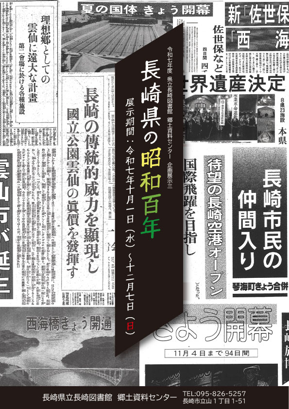 そこで長崎県立長崎図書館郷土課/郷土資料センターでは、この100年の間に長崎県内で起きた出来事やイベントなどを取り上げ、当館所蔵の資料を中心に展示をおこないます。特に今回は大村市歴史資料館のご協力をいただき、今年開港50年を迎えた「長崎空港の歩み」について、重点的に展示をおこなうことができました。